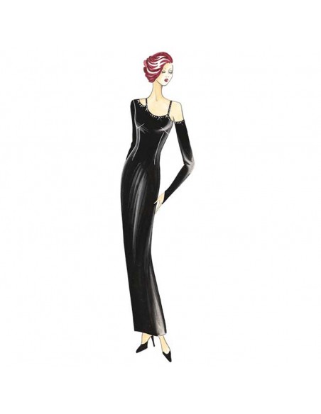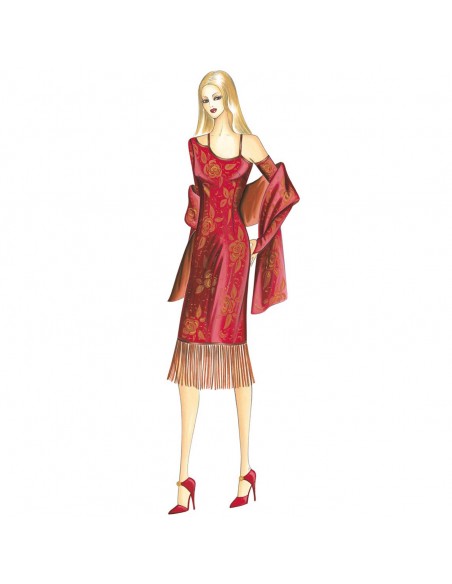 Abito stile “Anni ’20” in tessuto laminato o velluto dévoré, scollatura con spalla singola scoperta e orlo con frangia in seta. Realizzabile anche in lungo.