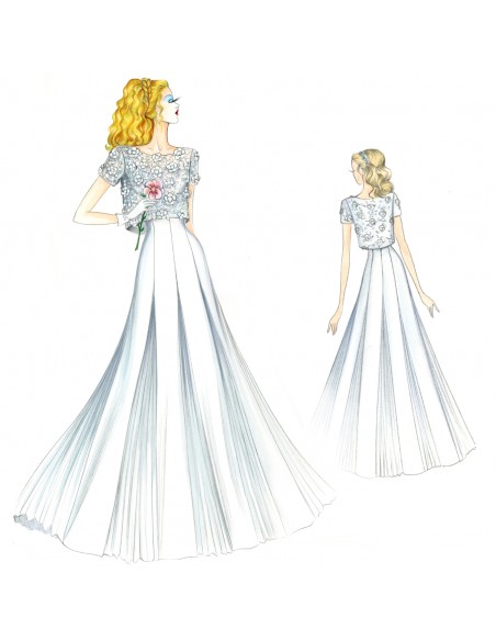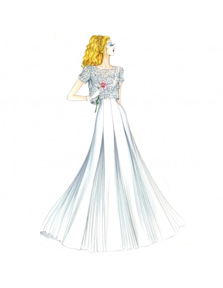 Spicchi plissettati si inseriscono armoniosamente nella gonna dell’abito in crêpe senza maniche, impreziosito dalle roselline che finiscono sul bolero chiuso in pizzo.