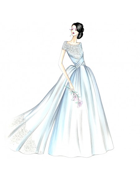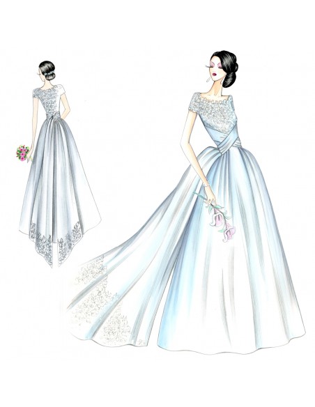 È giovane e romantico l’abito dall’essenziale corpino in pizzo macramé movimentato da pannelli incrociati che si annodano sul dietro e scendono a strascico. Tessuto consigliabile organza o shantung.