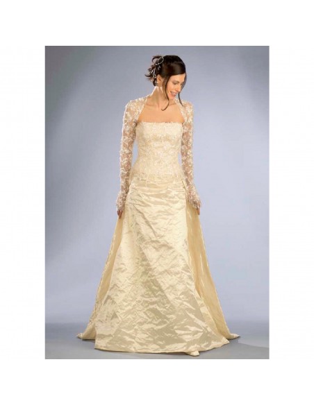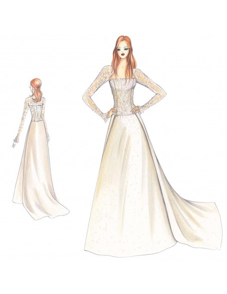 Giovane è l’abito con bustier a décolleté realizzabile in macramè ad effetto rete sfilato ai bordi, la gonna svasata in taffetas metallizzato o raso ha uno strascico minimalista quadrato al fondo che in vita scivola leggermente sul davanti. Coprispalle corto con maniche a guanto che scendono sul palmo della mano.