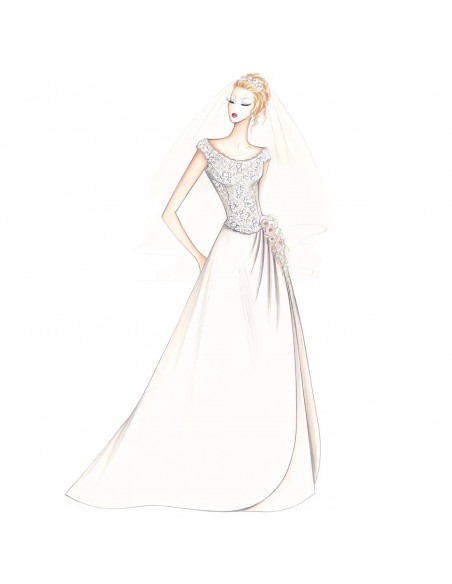 Romantico completo con bustier stondato sul décolleté realizzabile in pizzo, gonna in organza tripla o raso dalla sopragonna in organza leggera o chiffon aperta lateralmente e mossa da un morbido drappeggio siglato con una cascata di fiori.