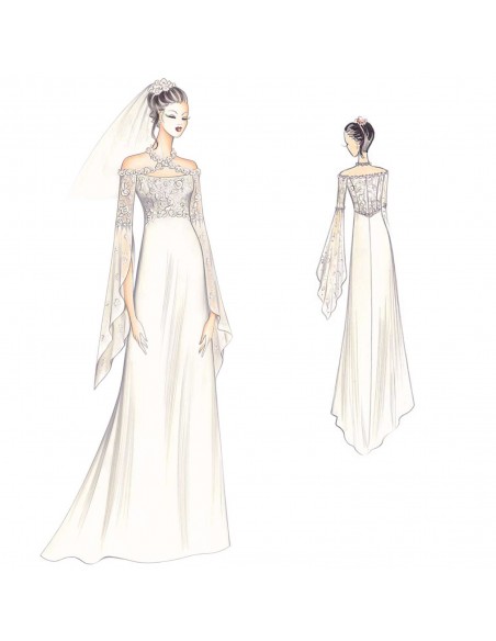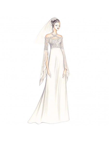 Ispirazione rinascimentale per l'abito ad impero che lascia le spalle scoperte con importanti maniche attillate che si aprono in volants a fazzoletto in chiffon ricamato; gonna con strascico realizzabile in ratzmir o raso.