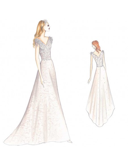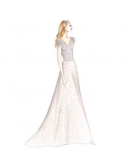Preziosi tessuti per l’abito dalle linee pulite con corpino leggermente sceso in pizzo scollato a V dalle manichette a kimoncino siglate con pendenti in cristalli. La gonna svasata che si allunga nello strascico è realizzabile in organza goffrata, taffetas metallizzato o cloqué di seta.