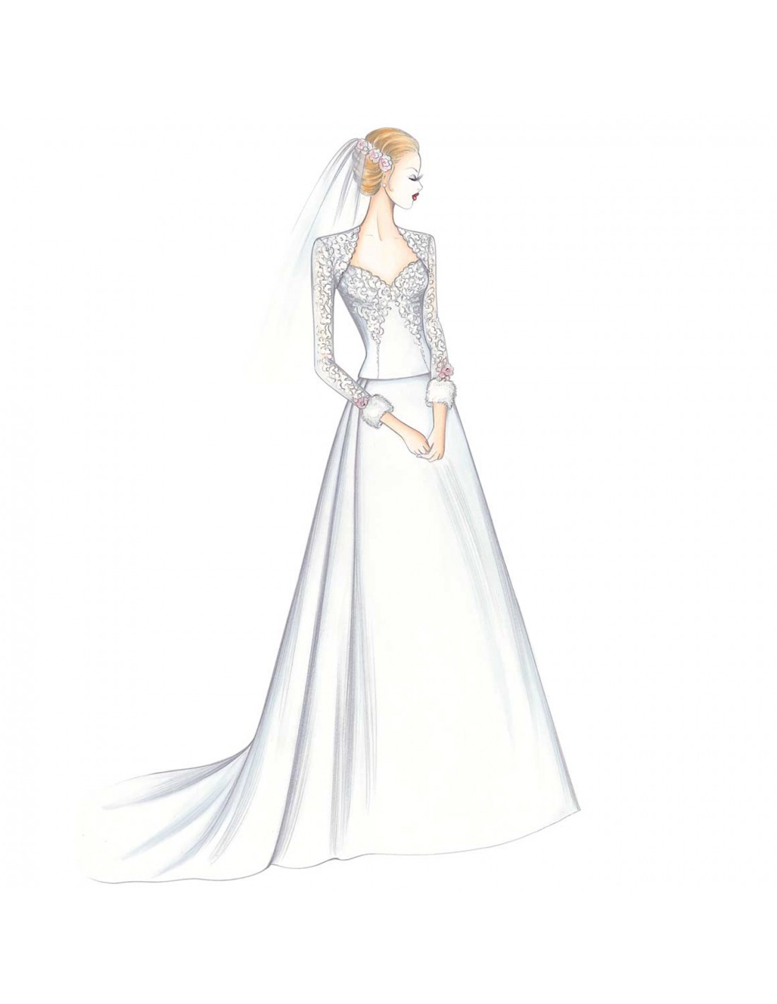 Prezioso pizzo Alençon scende lungo il bustier nell’abito con gonna svasata mossa sullo strascico da pieghe e corto coprispalle stondato dai polsi in pelliccia. Realizzabile in mikado o raso Duchesse o, per una versione più estiva, in taffetas e pizzo Chantilly.