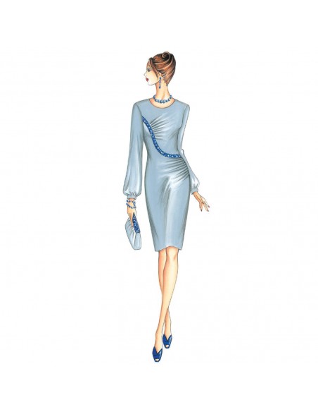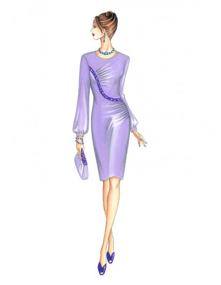 Elegante e raffinato è l’abito asimmetrico di linea modellata mosso da drappeggi laterali alternati con taglio a onda impreziosito da bordo ricamato con perle e maniche arricciate ai polsi. Realizzabile in jersey o crêpe, anche con maniche in chiffon.