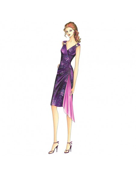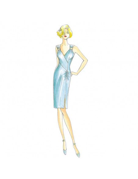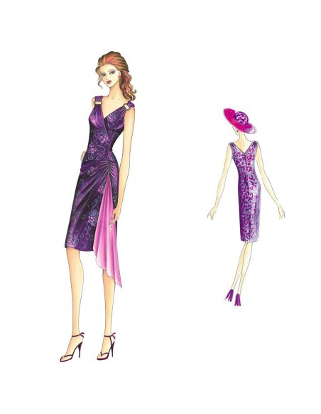 Abito asimmetrico con motivo di arricciature morbide sulle spalle e nella gonna diritta realizzabile con o senza pannello a punta in voile. Tessuti consigliati: jersey, crêpe o raso charmeuse.