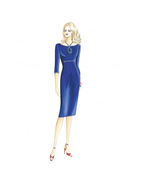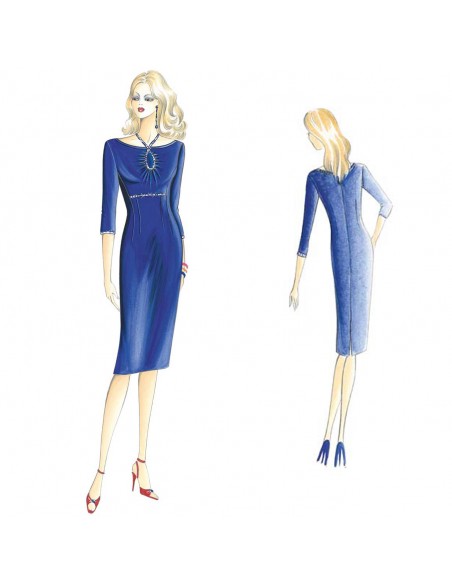 Elegante tubino modellato con motivo a goccia che converge sulla scollatura a barchetta e trattiene un’ arricciatura a raggiera, profilato con un bordino in strass come il taglio ad impero ed i polsi delle maniche a 3/4. Realizzabile in crêpe, velluto liscio morbido, jersey.