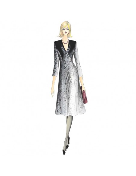 Abito di linea a redingote, consigliabile in velluto devorè o jersey, con plastron sagomato e ammorbidito da doppie piegoline sullo scollo a V, realizzabile in velluto liscio o pizzo, maniche a 3/4.