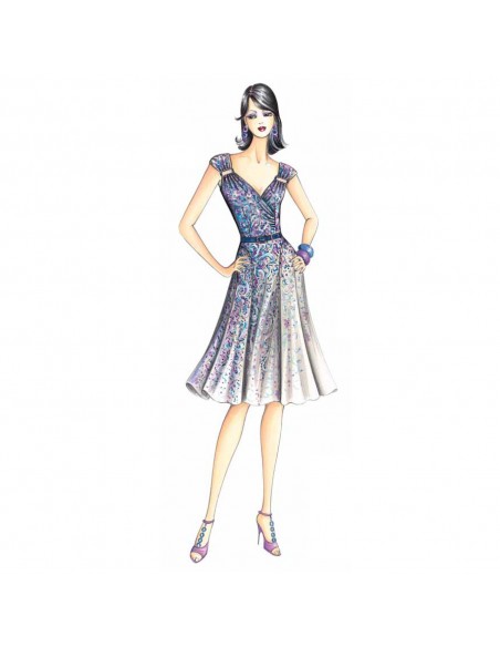 Atmosfere Anni ‘50 per l’abito con corpino incrociato e drappeggiato, scollatura a cuore e maniche a kimoncino, la gonna dalle riprese arcate è resa mossa da pieghe lasciate morbide.