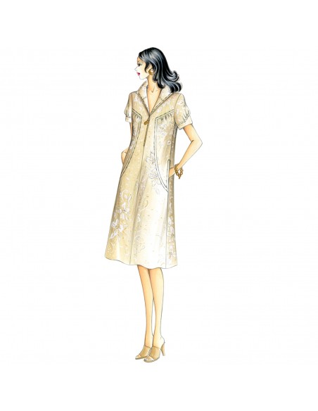 Abito a camicia di linea svasata con collo a polo chiuso da zip, tagli sagomati che trattengono una leggera arricciatura, tasche interne inserite nella fianchina, maniche a palloncino con polso sagomato a punta, prone sulle spalle. Realizzabile in batista o mussola.