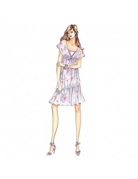 Corto abito d’ispirazione botticelliana con motivi a coulisse a creare effetto ad impero e blusante al fondo, ampia scollatura a V e maniche corte a kimono. Realizzabile in voile o jersey.