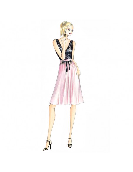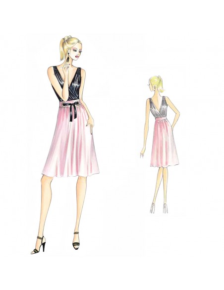 Abito a vita alta con corpino a pannelli incrociati e drappeggiati, fascioncino con nastro annodato passante e gonna svasata. Realizzabile in jersey, satin e chiffon doppiato nel corpino.