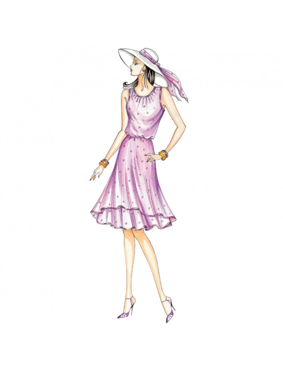 Abito dal corpetto blusante con coulisse elasticizzata o segnato da cintura, giro manica all’americana e doppia gonna a godet, tessuto consigliabile voile o rasatello.