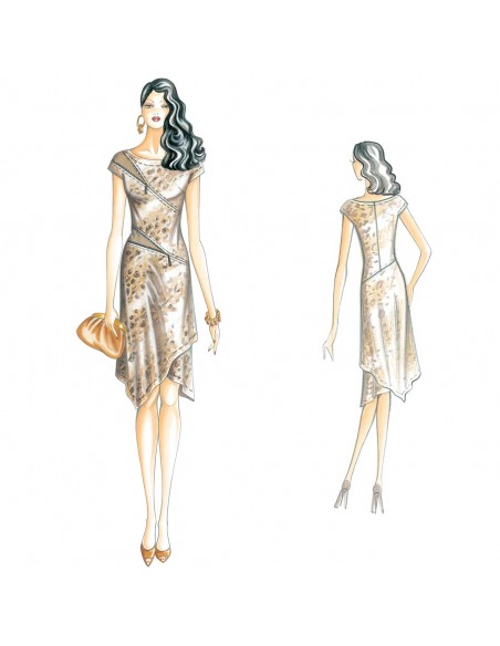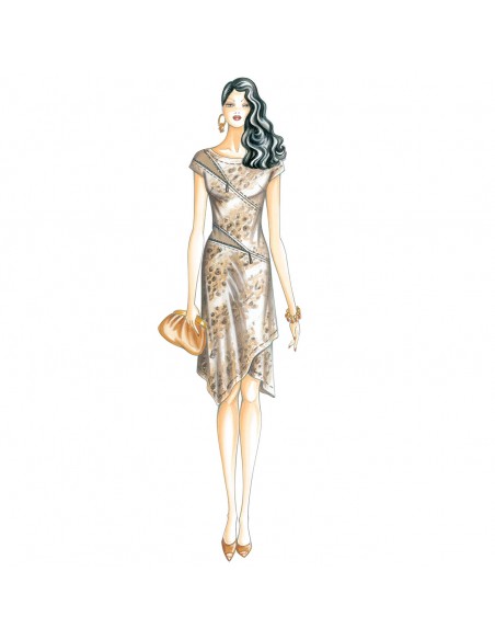 Abito asimmetrico di linea modellata attraversato diagonalmente da delle zip che creano aperture velate da chiffon su una spalla e sul fianco, scollatura a barchetta, maniche a kimoncino e gonna a due strati con punte a fazzoletto. Realizzabile in satin, jersey, crêpe de chine.
