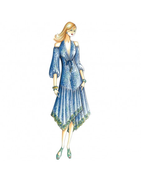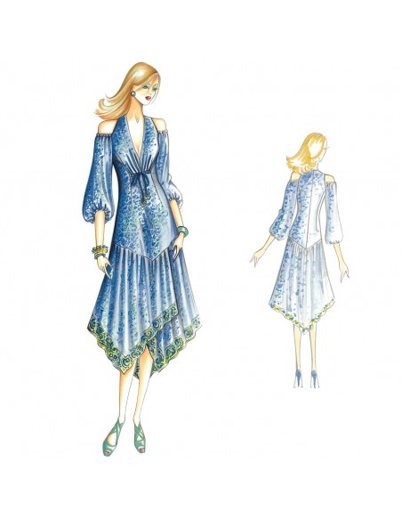 Abito modellato con motivo a coulisse sul taglio ad impero, scollatura a V, ampie maniche arricciate con apertura che lascia le spalle scoperte e gonna a pannelli incrociati con motivo a fazzoletto a tre punte. Realizzabile in voile, mussola, crêpe de chine.