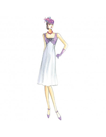 Abito con drappeggio sulla scollatura e gonna con tagli a redingote che snelliscono la figura.