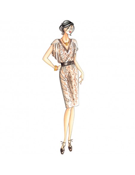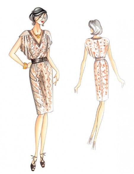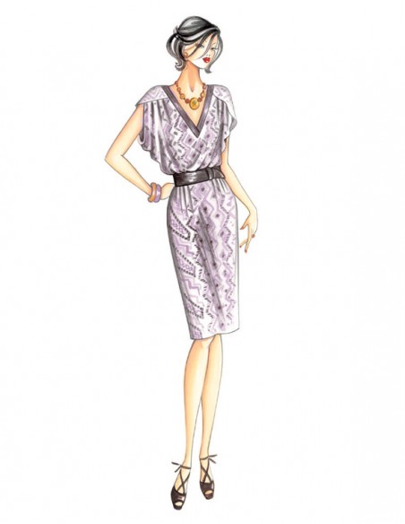 Abito con punto vita arricciato e cintura in pelle, corpino con maniche a kimono e fianco con tessuto intero, spalla intera con il dorso che forma carrè.