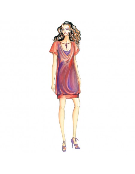 Mini abito da realizzare in jersey di cotone di linea modellata, a cui si sovrappone l’abito in voile di linea a trapezio con orlo a palloncino, maniche raglan, collo a cappuccio fermato da collana.