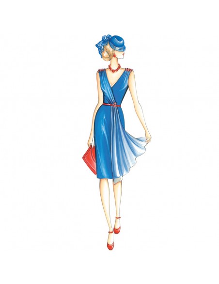 Abito di linea diritta con corpetto drappeggiato e pannello inserito al punto vita. Tessuto consigliabile organzino o crêpe-satin.