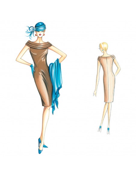 Tubino reso elegante dal collo con motivo di pieghe. Consigliabile in crêpe-satin, rasatello o taffetas.