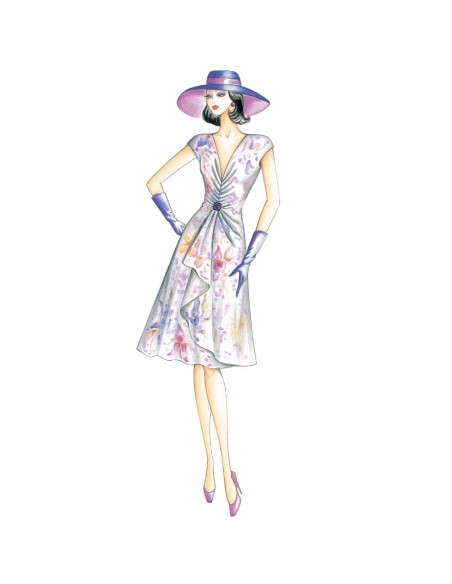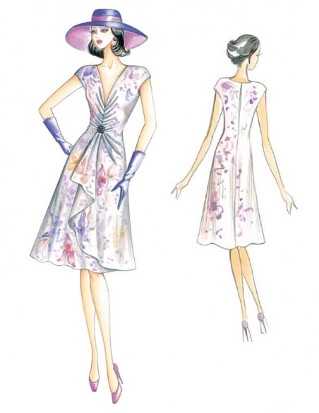 Abito dal corpino con drappeggio e scollo a V, brevi maniche a kimoncino, gonna svasata con singolo pannello.