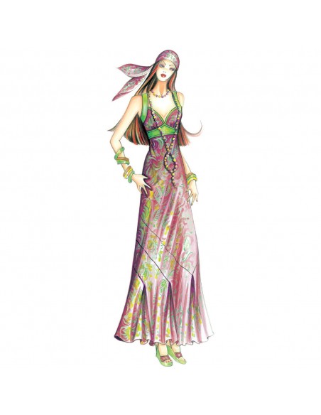 Abito folk da realizzare in leggero cotone fantasia con bordi colorati, gonna con tagli diagonali e spicchi inseriti.