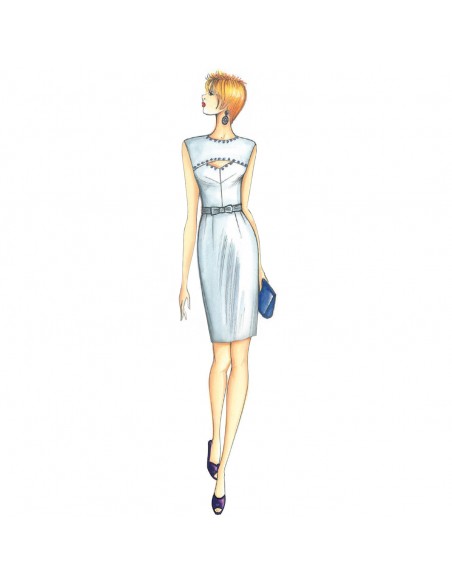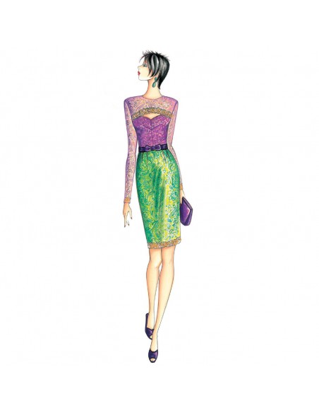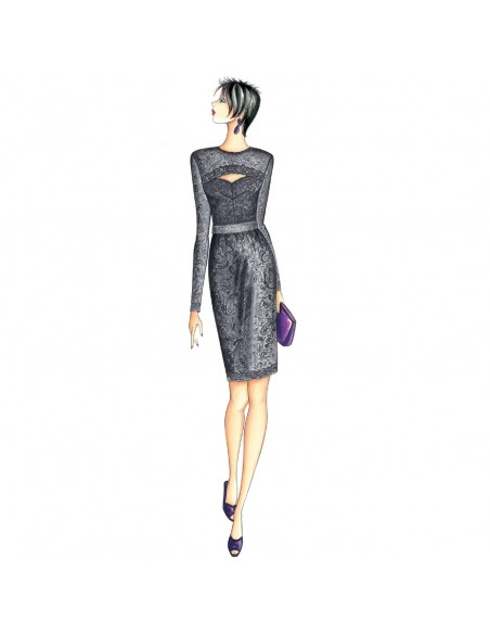 Tutta la preziosità del pizzo chantilly per questo abito di linea modellata con corpino a bustier e carrè dal taglio arcato che lascia un’ apertura sul decollété, maniche a guanto e gonna a tubo. Si può fare in pizzo a più colori o interamente in tinta unita con cintura in strass. Realizzabile anche in crepe senza maniche.