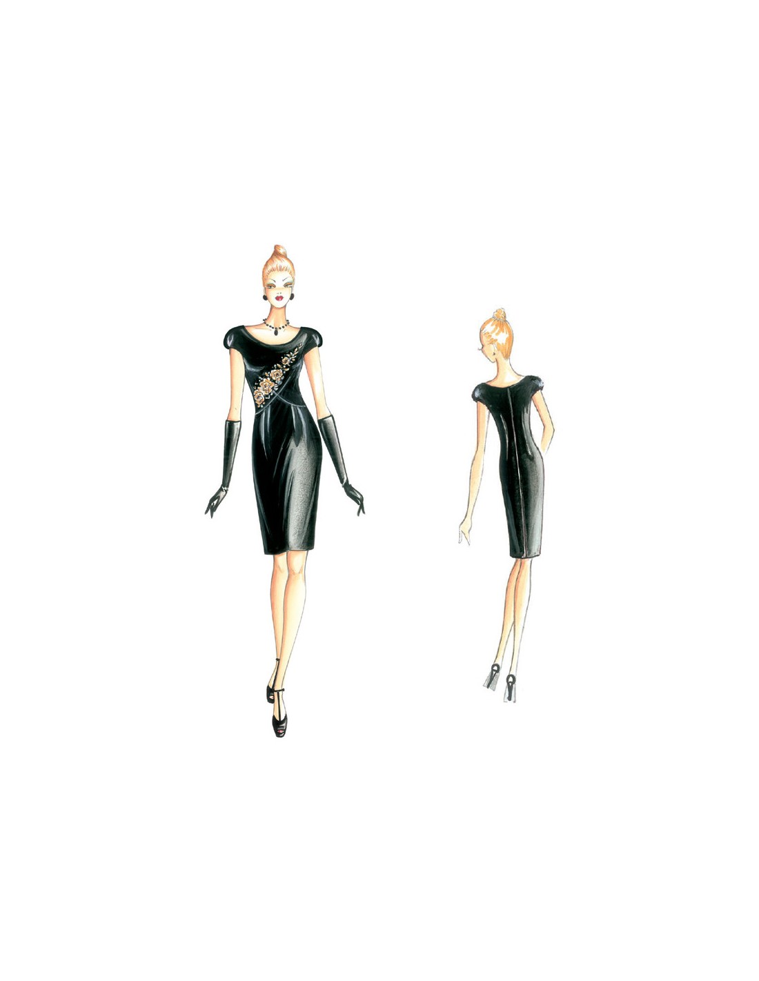 Un ricamo od applicazione in pizzo percorre diagonalmente il corpino in questo abito di linea modellata con riprese a X, maniche a kimoncino con piccolo fondopiega, scollatura rotonda e gonna a tubo con doppie pinces. Realizzabile in crêpe od organza.