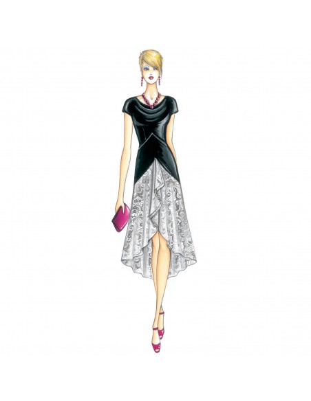 Elegante abito con collo a cappuccio, corpino con tagli a V e gonna svasata che scende nel dietro e forma un morbido volant nel centro davanti. Tessuti consigliati: crêpe-satin bicolore, fantasia o con gonna in pizzo chantilly.
