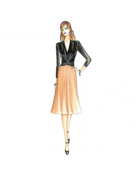 Abito da realizzare in tessuti contrastanti ad effetto due pezzi con corpetto a pannelli incrociati che formano drappeggio in vita e gonna divisa in quattro teli svasati. Consigliabile in jersey o crêpe.