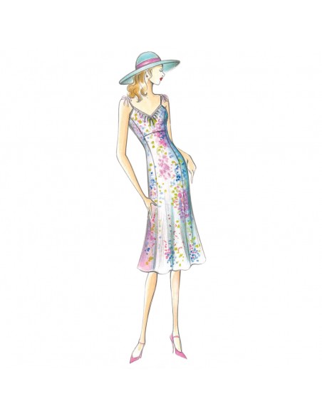 Abito a sottoveste diviso in teli svasati al fondo con arricciatura sulla scollatura a V. Tessuti consigliati: jersey, crêpe de chine, voile. Cardigan n. 6130.