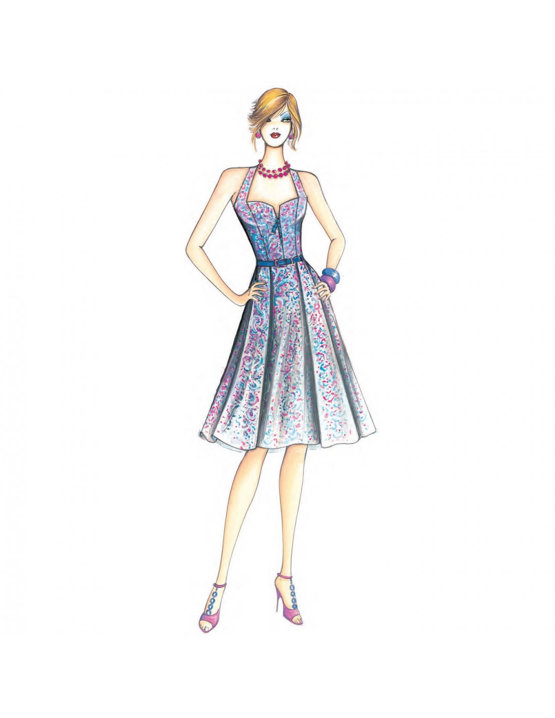 Abito stile anni ’50, corpino a bustier e gonna divisa in teli, tasca all’interno del cannoncino. Consigliabile in rasatello.