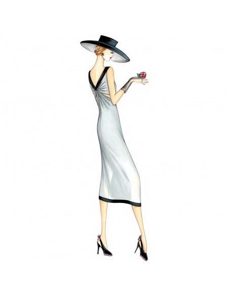 Abito longuette di linea modellata con motivo sul dorso di drappeggio con fessura posta sul fianco. Tessuti consigliati: crêpe, jersey o rasatello.