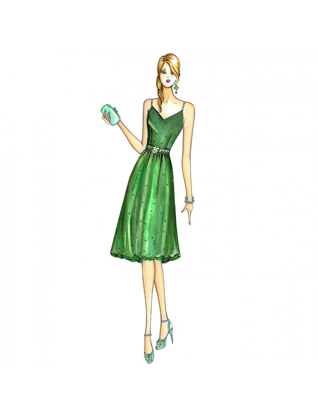 Romantico stile boho per l'abito dal corpino attillato, maniche arricciate alle spalle e ai polsi, ampia gonna in tessuto sbieco con volant applicato in diagonale. Realizzabile in varie lunghezze e con corpino di linea a sottoveste. Tessuti consigliati: mussola, chiffon, cady.
