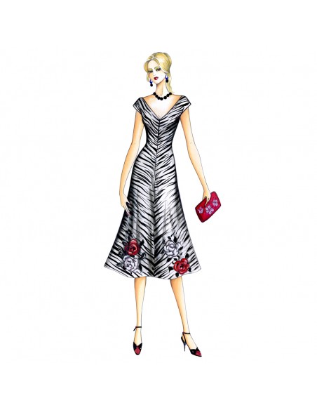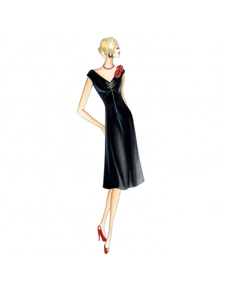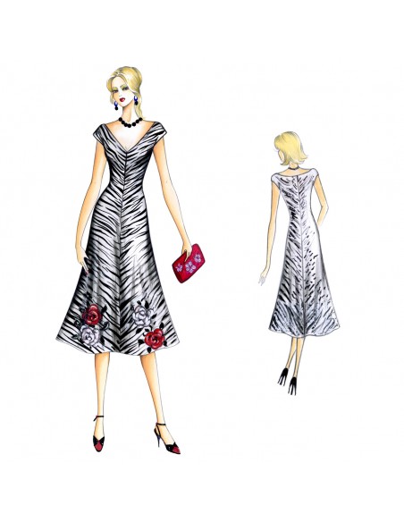 Elegante abito longuette dall’ampia scollatura con arricciatura nel corpetto, maniche a kimoncino e gonna svasata divisa in quattro teli, realizzabile con o senza taglio sottoseno.