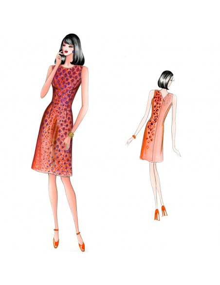 Abito stile anni ’70 di linea svasata, giromanica rientrante e scollatura a V nel dorso. Giacca n. 7187.