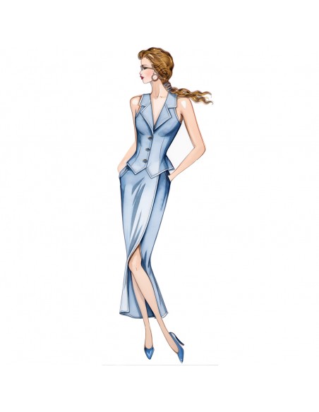 Abito consigliabile in lino con corpetto che simula gilet e gonna con davanti a portafoglio von nastri che si annodano nel dorso.
