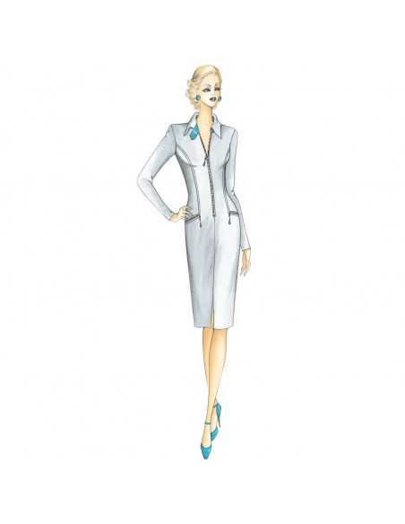 Abito con collo a camicia da realizzare in flanella o crêpe con finiture in tinta contrastante, tasche fermate a zip.