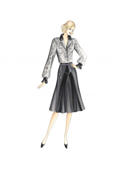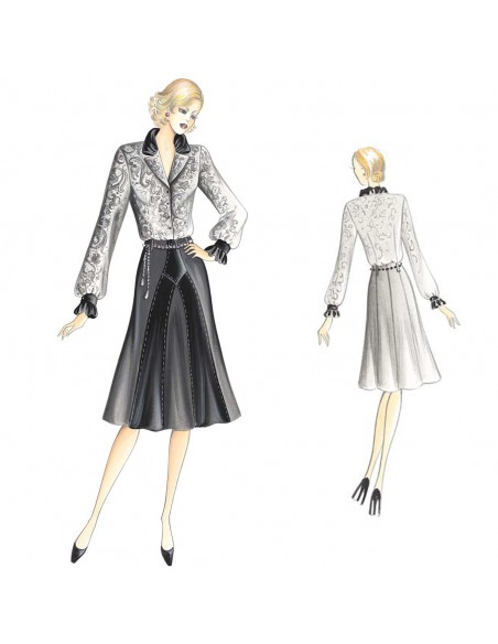 Romantica ed elegante blusa, realizzabile in velluto devorè o pizzo, con originale collo doppiato mosso da arricciatura come i posi, realizzabili in velluto liscio o taffetas. Gonna n. 1080.