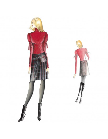 Blusa dalle maniche arricciate con nastro annodato e collo a fascetta, consigliabile in jersey. Gonna n. 1098.