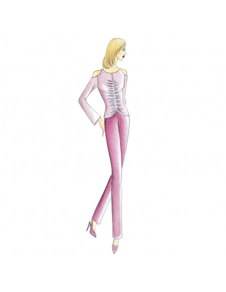 È percorsa da un drappeggio centrale fermato da un bordo in strass o coulisse la blusa di linea modellata con aperture a fessura sulle spalle e sulle maniche fermate da bottoncini. Realizzabile in chiffon o tulle ricamato. Gonna n. 9559.