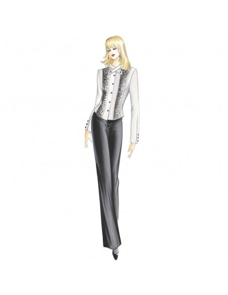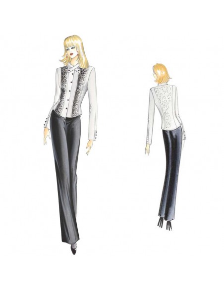 Blusa-camicia di linea modellata, realizzabile in batista o satin, con collo a fascetta incrociata, cannoncino sulle maniche fermato ai polsi da bottoncini ed inserti sia sul davanti che dietro in pizzo, georgette o tulle.