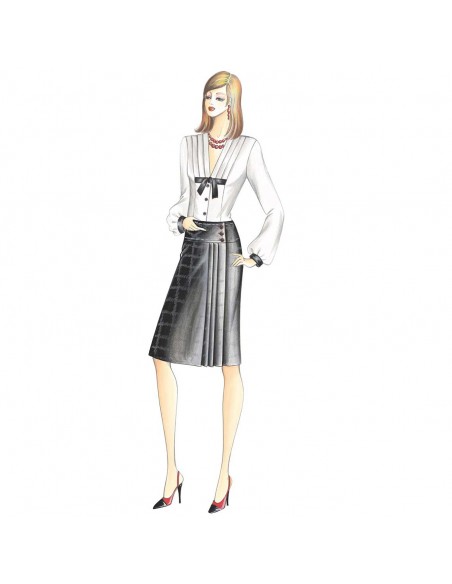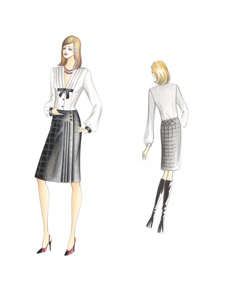 Blusa di linea accostata con motivo a triple pieghe che percorrono la scollatura a V e vengono siglate da un nastro a impero in colore contrastante come i polsi. Realizzabile in crêpe de chine, mussola di cotone o georgette. Gonna n. 1091.