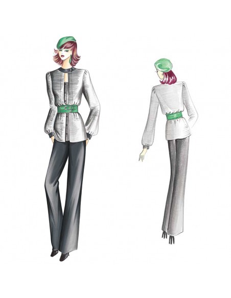 Blusa da realizzare in satin rigato o jersey, linea morbida fermata in vita da alta cintura in pelle, collo con bottone laterale e maniche arricciate sulle spalle.