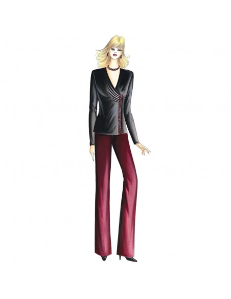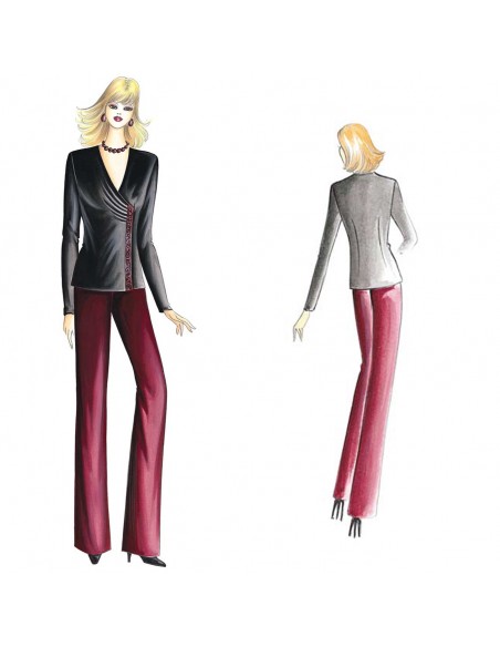 Blusa modellata, realizzabile in jersey, con scollo a V drappeggiato e bordo laterale in velluto o chiffon con paillettes. Cappotto longuette di linea a trapezio da realizzare anche lungo alla caviglia n.1008.