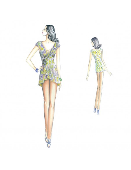 Blusa asimmetrica a kimoncino con volant singolo inserito nell' ampia scollatura a V, motivo a pannelli incrociati fermati da rosa in tessuto e orlo stondato che scende sul dietro. Realizzabile in jersey, satin, seta lavata, crêpe de chine.