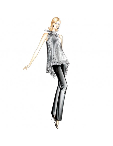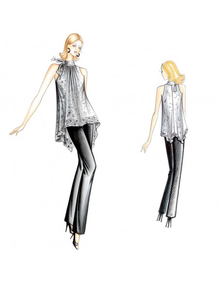 Casacca di linea svasata con punte a fazzoletto sul dietro, collo a fascetta annodato lateralmente che trattiene l’arricciatura e giro rientrante. Realizzabile in mussola, chiffon o crêpe de chine.