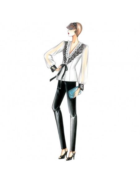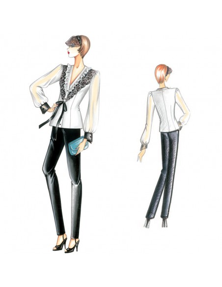 Blusa con plastron in pizzo, scollo a V con volant fermato alle spalle, maniche a camicia con polso a gemello.
