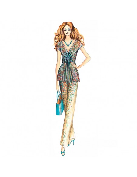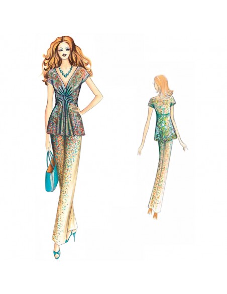 Blusa impero modellata con corpetto a pannelli incrociati che creano drappeggio a nodo, ampia scollatura a V e maniche a kimoncino. Realizzabile in jersey, chiffon o mussola.