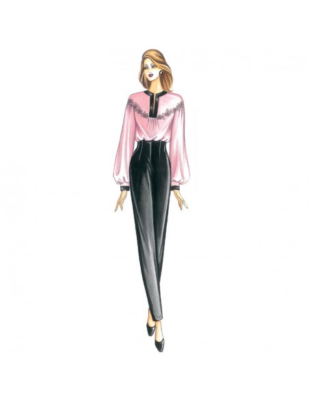 Blusa con carrè guarnito di pizzo, realizzabile anche in crêpe con maniche in chiffon. Abbinabile al pantalone n. 5155.